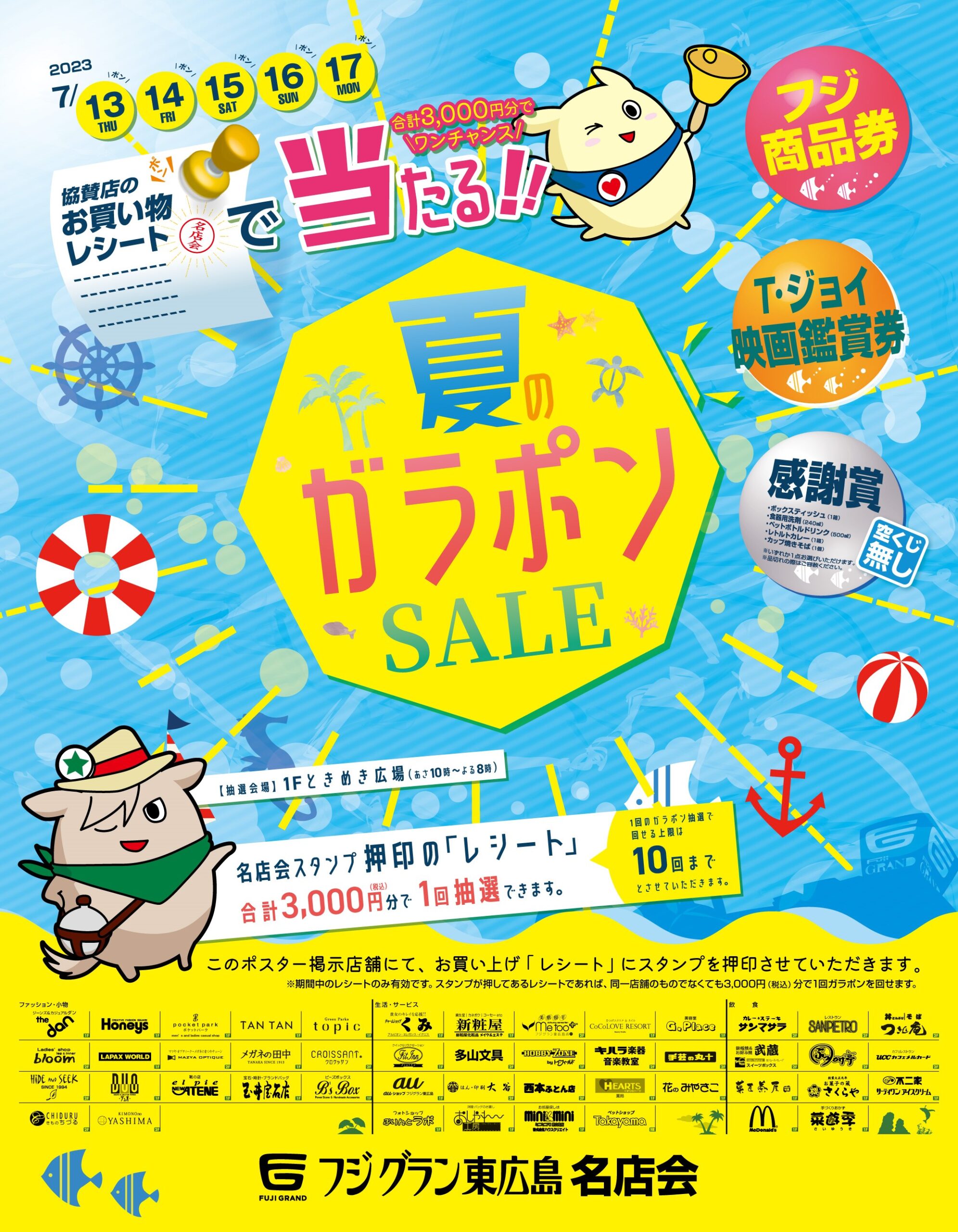 フジグラン東広島名店会 2023.07.13 サマーガラポンセール 抽選会開催! 開催期間:2023.07.13 ~ 2023.07.17 日頃の感謝を込めて。。。 毎年恒例のフジグラン東広島名店会 サマーガラポンセール開催!! 協賛店のお買物レシートで当たる! 合計3,000円分でワンチャンス! 空くじなし! 今年の感謝賞は色々選べます! 詳しくは↓↓↓ポスターで!
