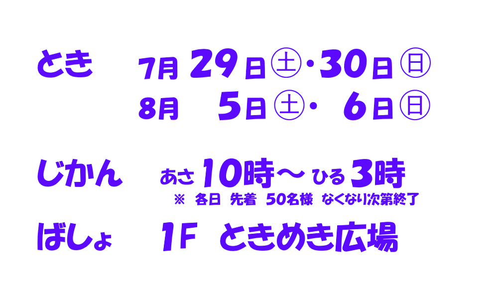 開催時間内でも、各日先着50名様のため、人数に達しましたら終了となりますので、是非お早めにご参加ください。