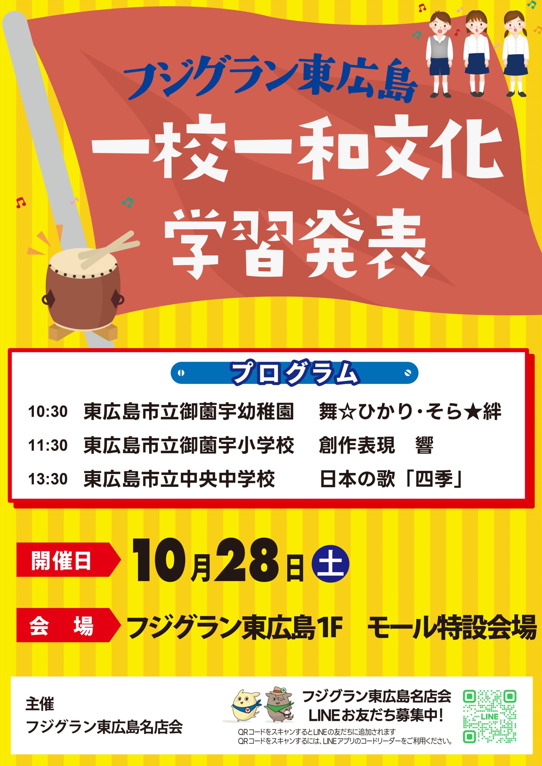 1F モール特設会場 2023.10.17 4年ぶりの開催! 1校1和文化学習発表!! 出演:御薗宇幼稚園、御薗宇小学校、中央中学校 開催期間:2023.10.28 フジグラン東広島で4年ぶりの開催です!! 1校1和文化学習発表!! 東広島市では平成20年度から全市立幼稚園、小学校、中学校で「一校一和文化学習」に取り組んでいます。子供たちが、日本の伝統や文化のもつ素晴らしさに触れ、継承し、郷土に誇りを持つことができ るようになることを目指し、すべての幼稚園、小・中学校において、「一校一和文化学習」を推進されています。(東広島市HPより)