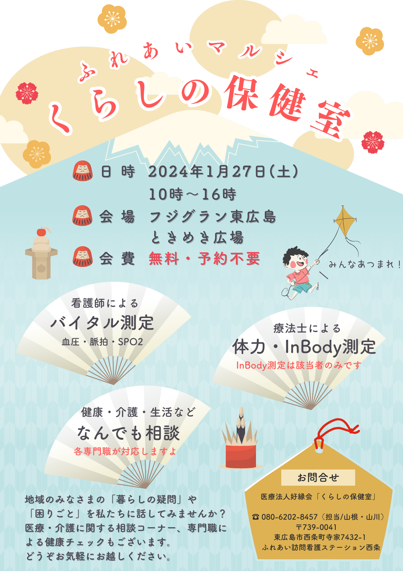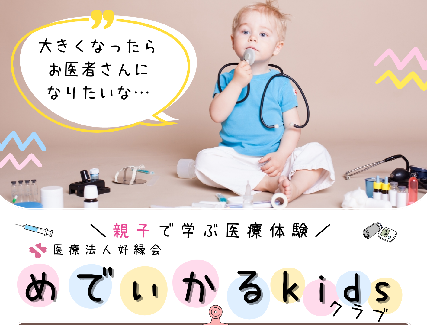 1F ときめき広場 2024.01.15 ふれあいマルシェ くらしの保健室 同時開催:親子で学ぶ医療体験 めでぃかるkidsクラブ 医療法人 好縁会 開催期間:2024.01.27 地域のみなさまの「暮らしの疑問」や「困りごと」を私たちに話してみませんか? 医療・介護に関する相談コーナー、専門職による健康チェックもございます。 親子で学ぶ医療体験 だれもが一度はあこがれる「お医者さん」と「看護師さん」になってみませんか? お父さん・お母さんと一緒に、楽しく、遊びながら、医療行為を疑似体験してみよう!!