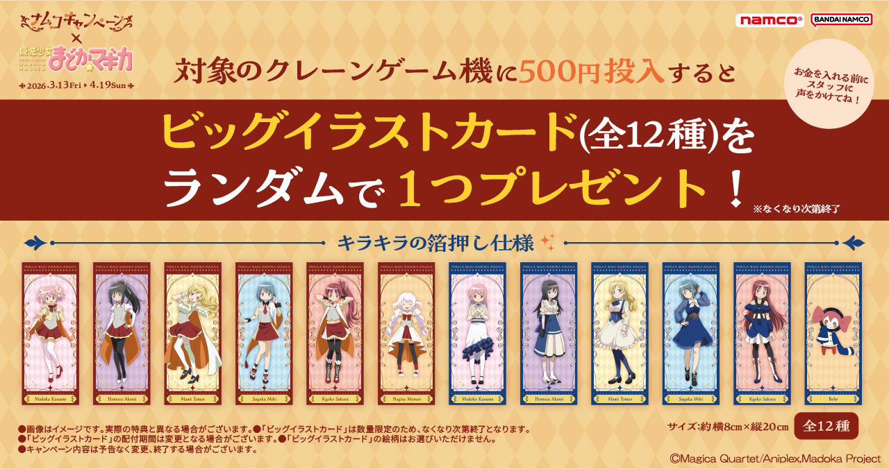 3月13日(金)より、『ナムコキャンペーン×魔法少女まどか☆マギカ』を開催! 対象のクレーンゲーム機で遊んでナムコ限定プライズや特典をゲットしよう!