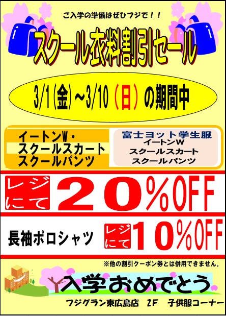 ご入学の準備はぜひフジで!! スクール衣料割引セール開催!!